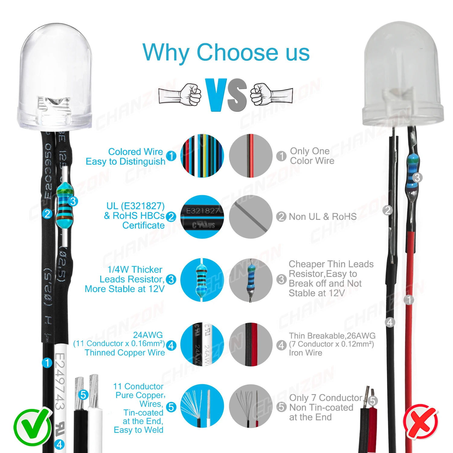 | CHANZON | 10 pièces/paquet | 10mm Diamètre/Transparent | Blanc/rouge/vert/bleu/jaune | 20mA | 12V (3V-12V pour différents objectifs de luminosité) | Anode (fil de couleur) | Cathode (fil noir) | Voir l’image de spécification |
