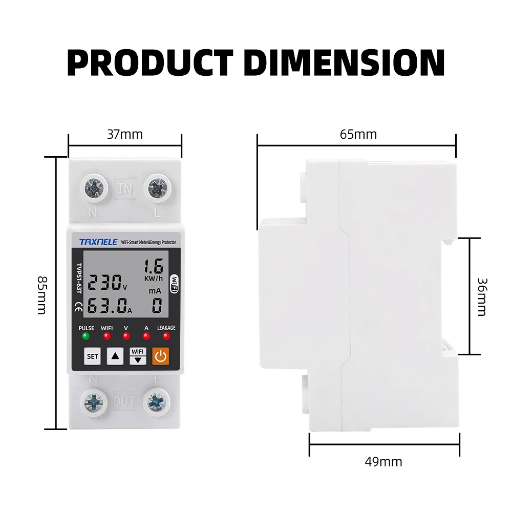 Il dispose également d’un temps de reconnexion réglable entre 10s et 90s et d’une protection contre les fuites électriques réglable entre 10mA et 99mA. Il affiche la puissance consommée jusqu’à 99999.9kw/h et possède un compteur de tension, un ampèremètre, un compteur d’énergie et une minuterie.