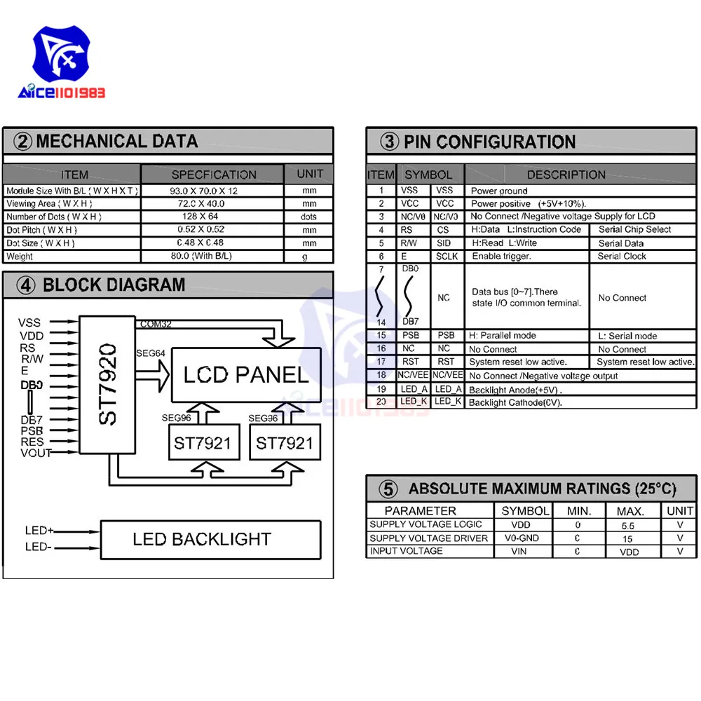 - Module d’affichage LCD 12864 Rétroéclairage graphique 128×64 points.