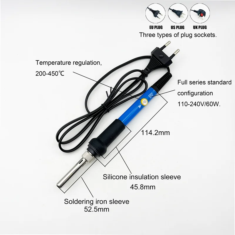 - Équipé d’Eu/US/UK et de fers à souder pour la sélection