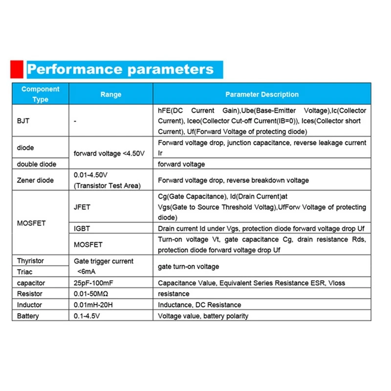 Capable de mesurer des transistors, transistors MOS, thyristors, transistors Darlington, IGBT (Remarque: le thyristor haute puissance, IGBT, peut ne pas être testé avec précision).