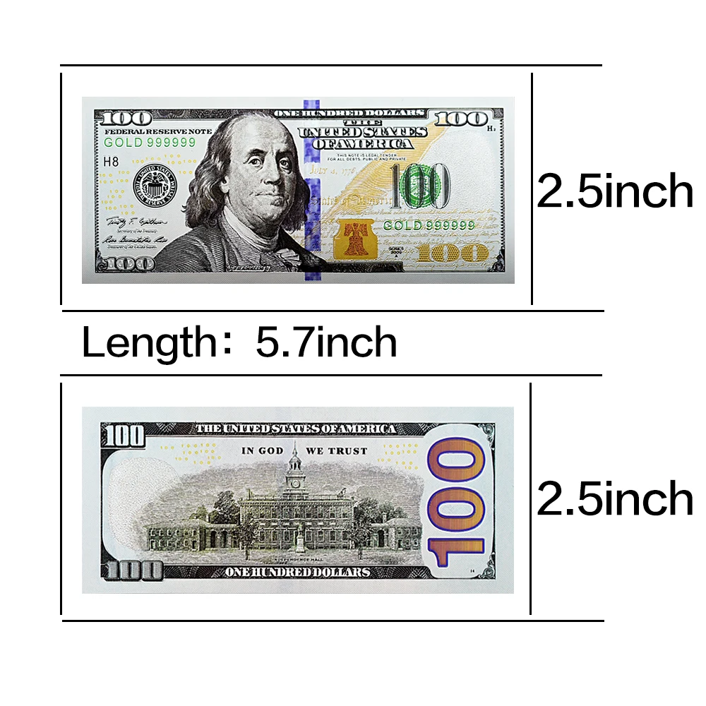 Les billets de banque sont de taille originale, ce qui signifie qu’ils ont les mêmes dimensions que les billets de banque réels.