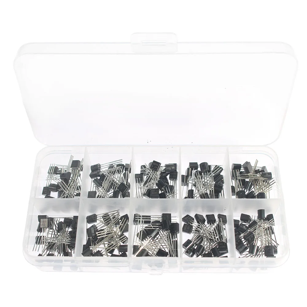 Ce kit comprend 10 valeurs différentes, avec 20 pièces de chaque valeur. Les valeurs incluses sont S8050, S8550, S9012, S9013, S9014, 2N3904, 2N3906, C1815, A1015 et MJE13001.