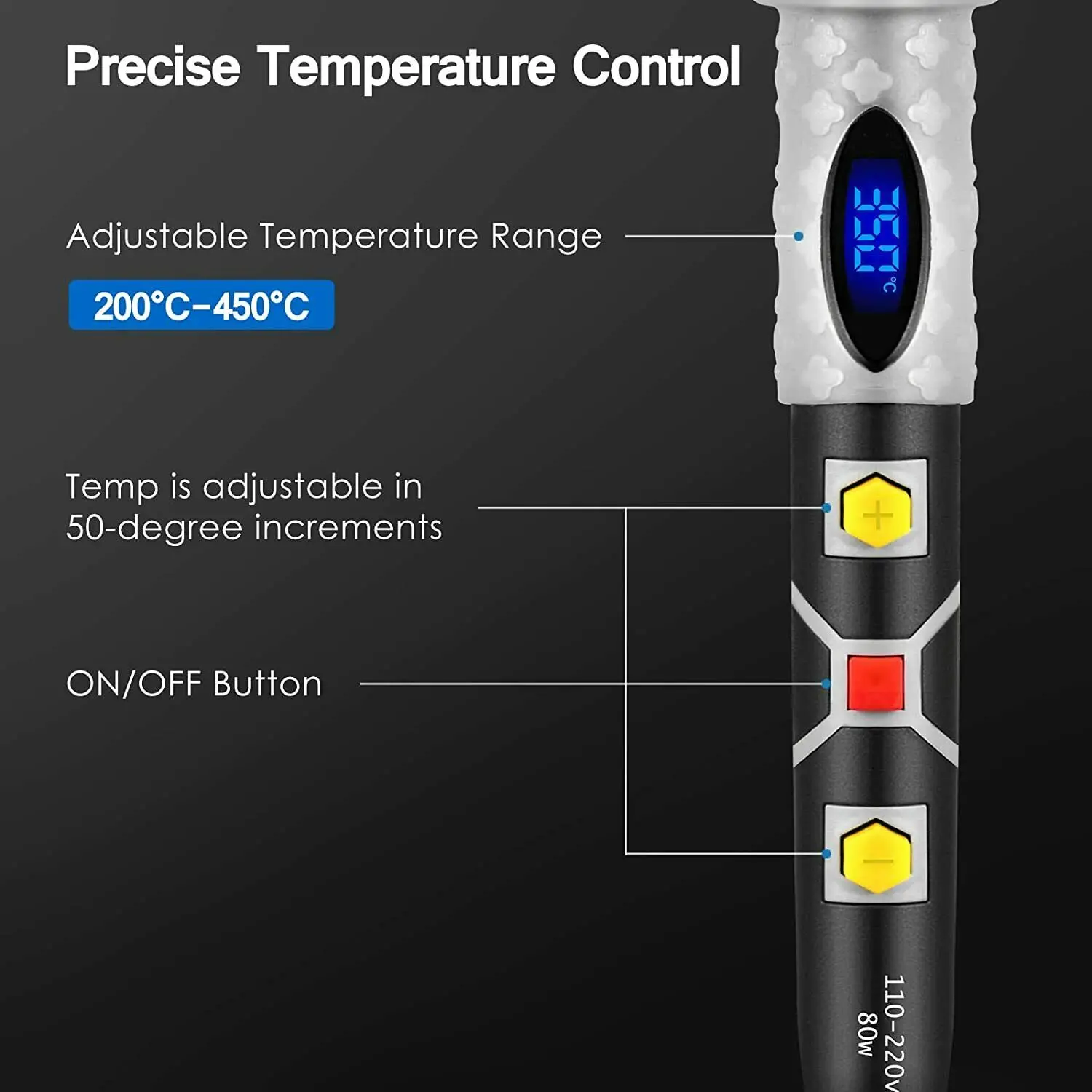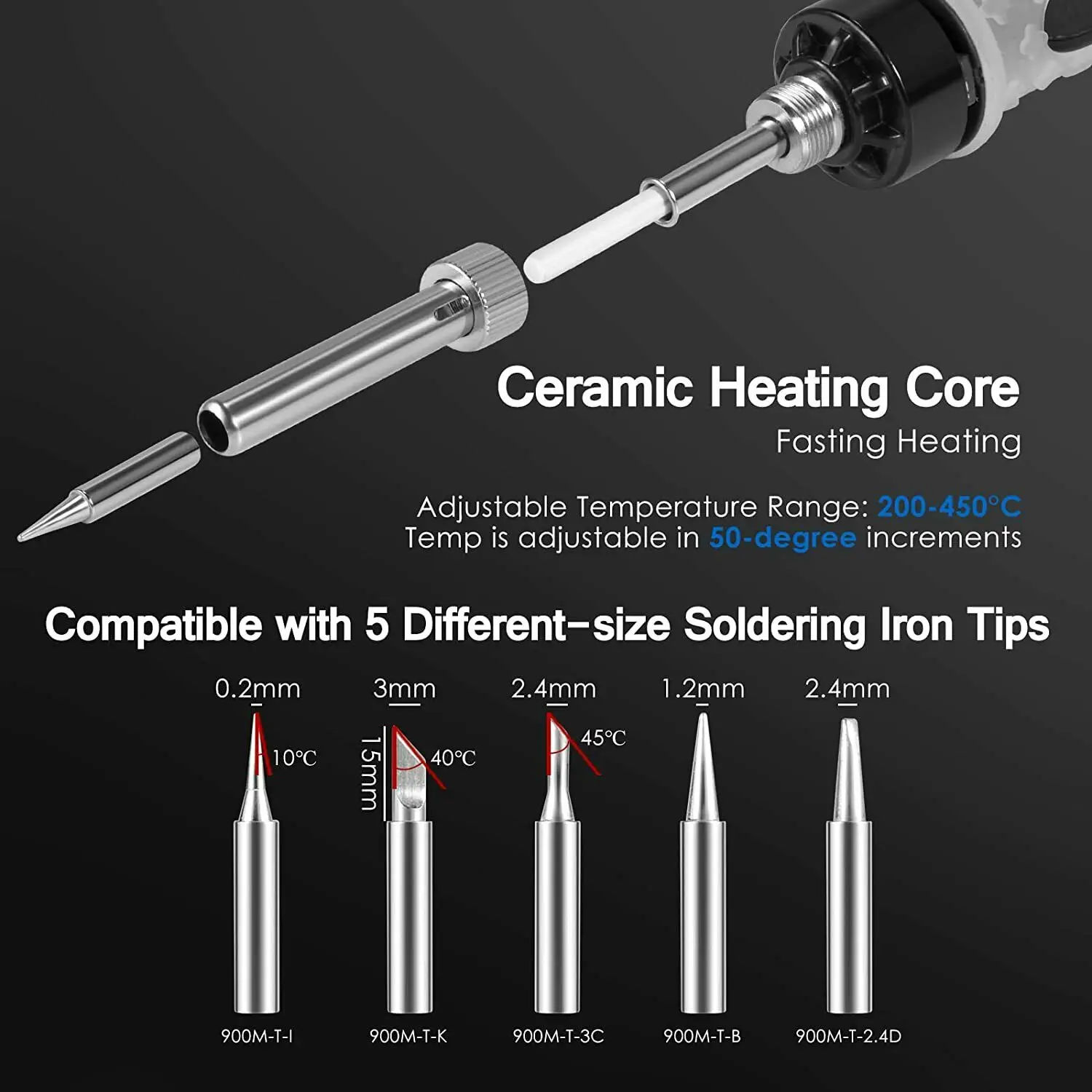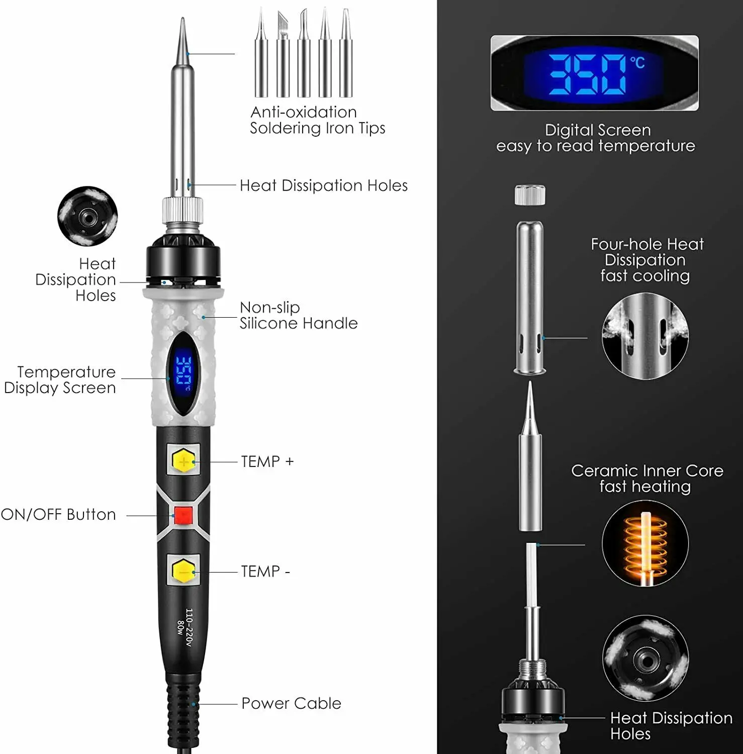 Conception améliorée et plus intelligente: écran LCD haute définition, état de la température plus clair. Conception de température réglable (de 392 ℉ à 842 ℉), ajustez la température en fonction de vos besoins par la touche Haut/Bas du fer à souder électronique (changement de 50 °C à chaque pression). Bouton marche/arrêt et voyant de travail, peut être ouvert, fermé et utilisé librement et facilement