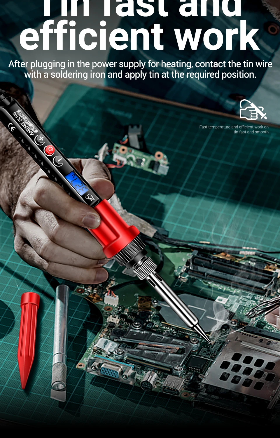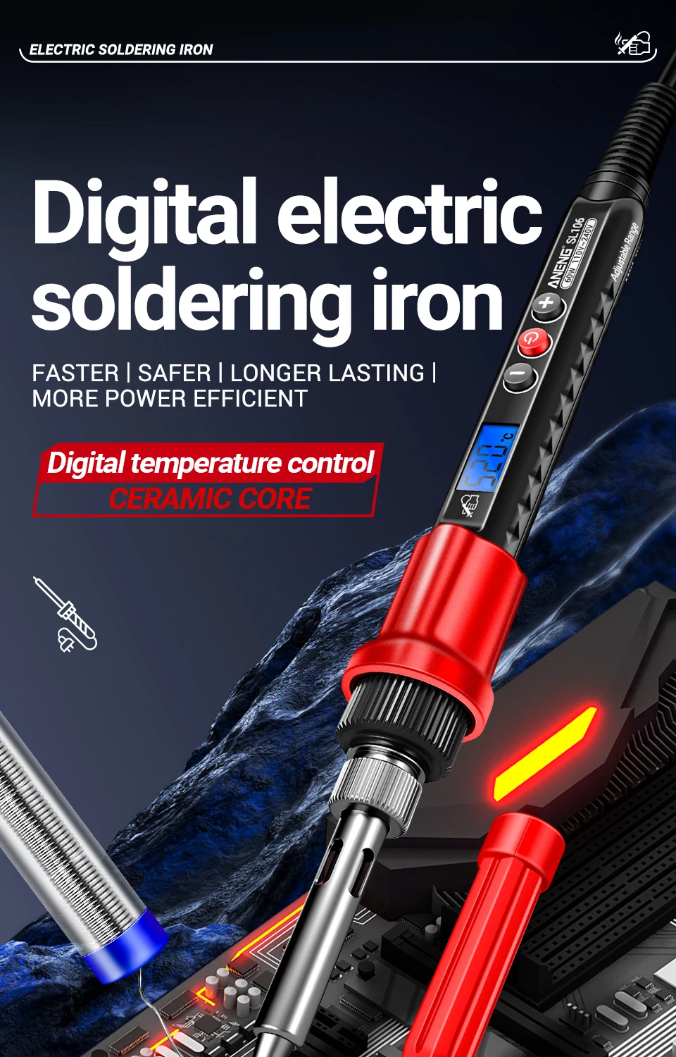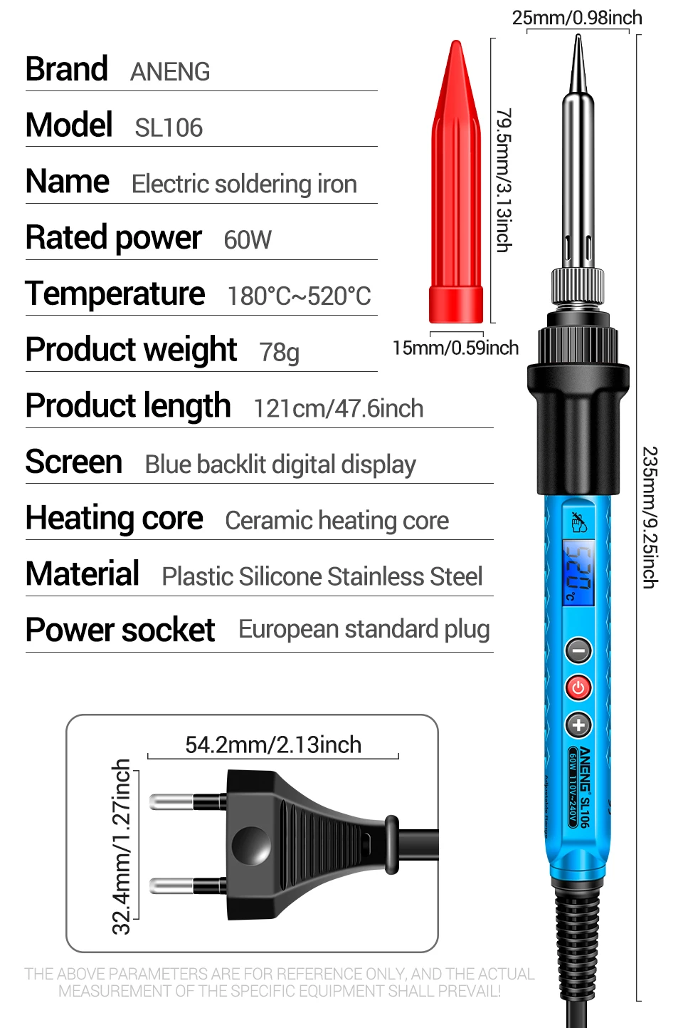 Le fer à souder électrique numérique ANENG SL106 est un outil de soudage polyvalent avec une température réglable de 180 ℃ à 520 ℃. Il est doté d’un noyau chauffant en céramique qui offre un chauffage rapide et une longue durée de vie. Avec son écran d’affichage numérique rétroéclairé bleu, vous pouvez facilement surveiller et régler la température de soudage.