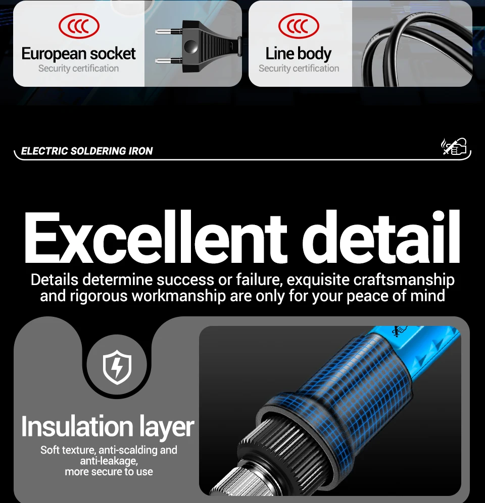 Ce fer à souder est livré avec une prise standard européenne et fonctionne avec une tension de 220V. Il est également disponible avec une prise US pour une tension de 110V. Il est léger et facile à manipuler, avec un poids de seulement 78g et une longueur de 121cm. Son matériau en acier inoxydable et en silicone offre une grande durabilité et une prise en main confortable.