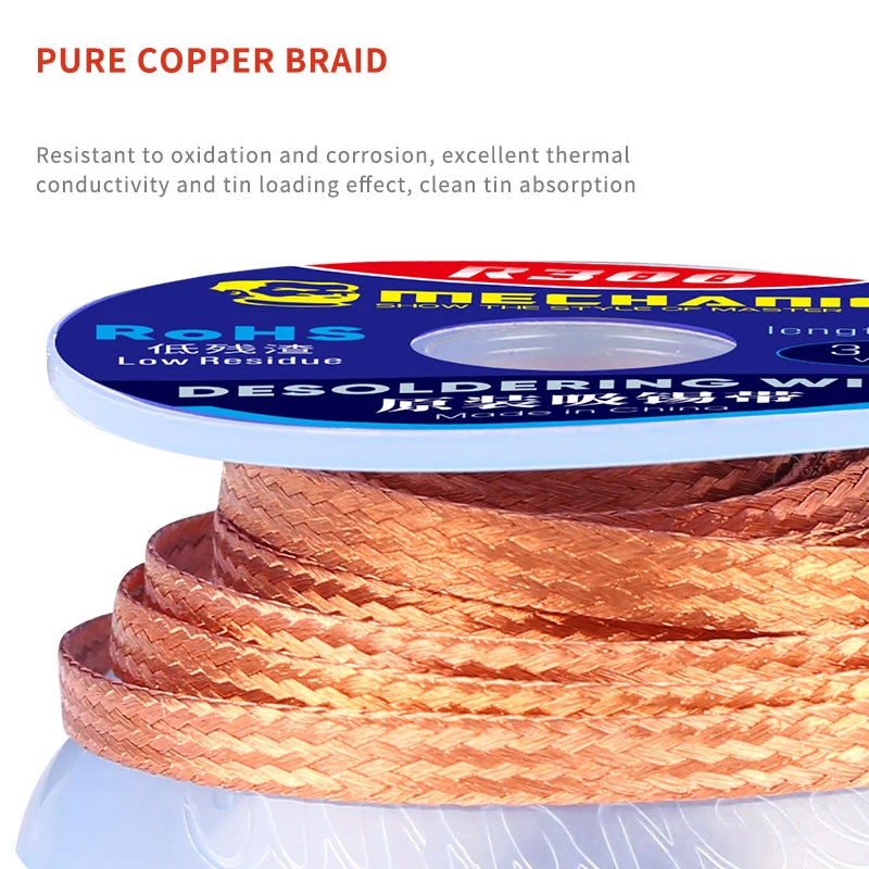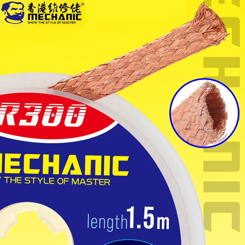 Le fil de soudure de mèche de tresse à dessouder MECHANIC est un outil de soudage expédide pour les PCB BGA. Il est disponible en différentes largeurs de 1.0mm, 1.5mm, 2.0mm, 2.5mm, 3.0mm, 3.5mm et a une longueur de 1.5m. Fait du cuivre fin, ce fil à dessouder est anti-oxydation et anti-corrosion.