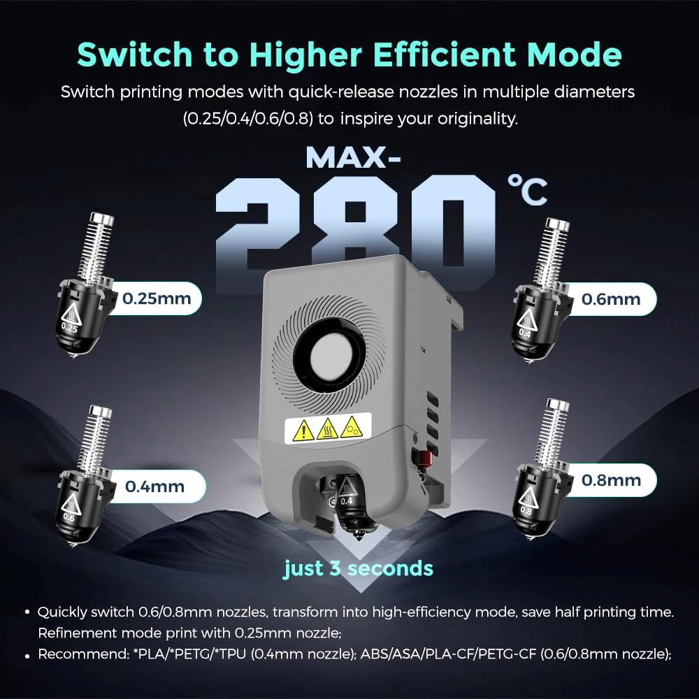 Diverses options de diamètre de buse (0.25/0.4/0.6/0.8mm) conviennent aux modes haute précision et haute efficacité.