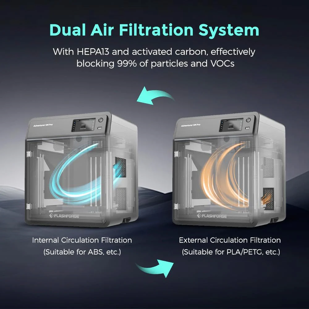 Adventurer 5M Pro adopte un double système de filtration de circulation interne et externe. HEPA13 et le charbon actif peuvent bloquer efficacement 99% des particules et des COV, protégeant ainsi votre système respiratoire.