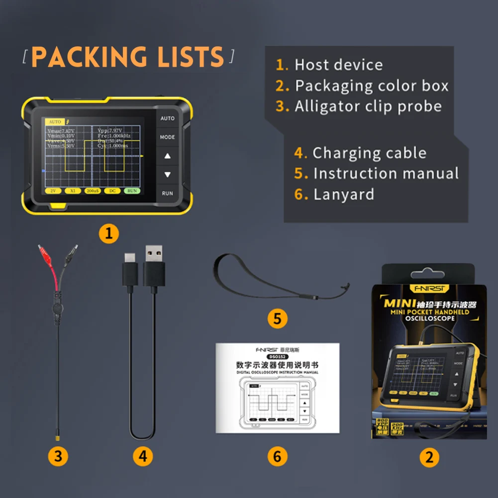 - Norme: 1 x oscilloscope, 1 x câble de données de type C, 1 x sonde commune, 1 x manuel