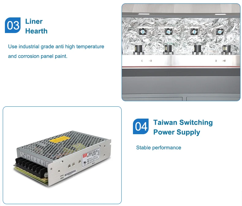 Cette machine adopte le tuyau de chauffage à ailettes d’acier inoxydable de type M avec la résistance à la corrosion, la résistance à hautes températures, la longue durée de vie et l’efficacité du feu vif. Coopérant avec le système de circulation d’air chaud, la structure de stockage de chaleur permet à la chaleur d’être entièrement utilisée. La structure d’isolation thermique multicouche minimise la perte de chaleur. La température est contrôlée par PID cercle fermé, avec un contrôle de température très précis.