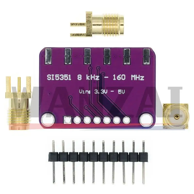 Le générateur d’horloge Si5351A est un générateur d’horloge contrôleur I2C. Il utilise l’horloge de précision embarquée pour piloter plusieurs PLL et diviseurs d’horloge à l’aide d’instructions I2C. En configurant la PLL et les diviseurs, vous pouvez créer des fréquences précises et arbitraires. Il y a trois sorties indépendantes, et chacune peut avoir une fréquence différente. Les sorties sont 3Vpp, par un en-tête de planche à pain-amical ou, pour le travail de rf, un connecteur facultatif de SMA.
