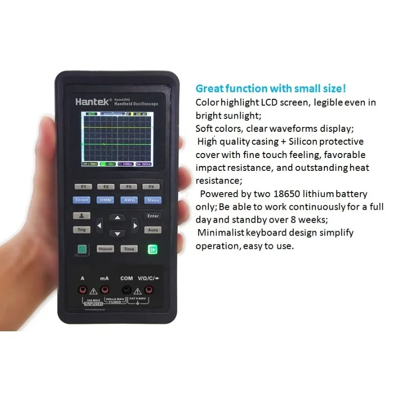 Une toute nouvelle série d’oscilloscope-Hantek2000 portables, il poursuit le concept compact et léger mais avec une nouvelle génération de testeur multifonction 3 en 1: oscilloscope, source de signal et multimètre; un petit volume de la poignée à but non lucratif par une seule main; Le support de suspension a été conçu pour prendre en charge le réglage multi-angle; Ultra-faible puissance, interface de charge de type C, Chaque 2 heures de charge de la batterie permet de travailler une journée complète ou deux mois en veille; Écran LCD couleur haute définition clair et délicat; La conception minimaliste du clavier simplifie le fonctionnement, facile à utiliser.
