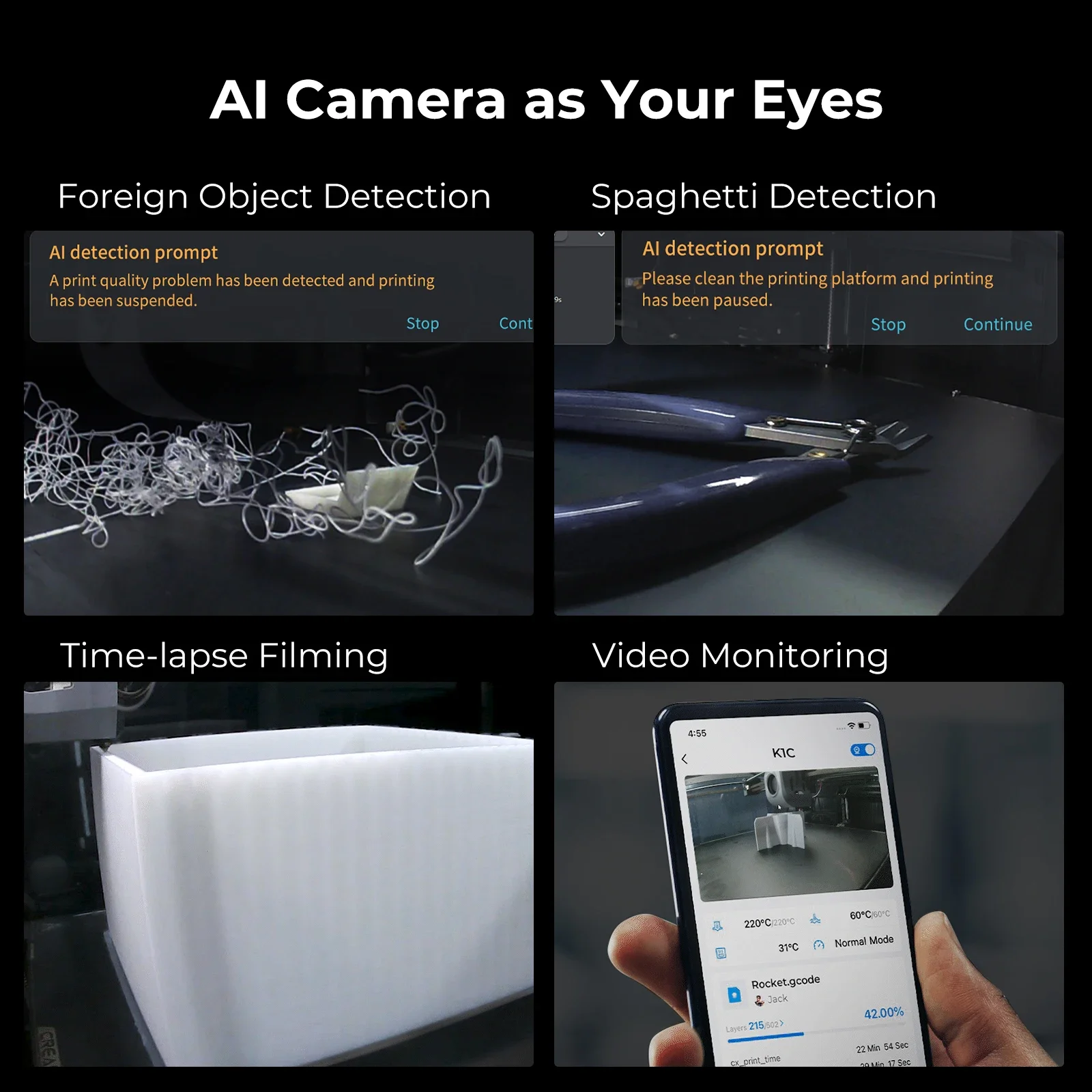 - Caméra AI intégrée pour surveiller l’impression à distance