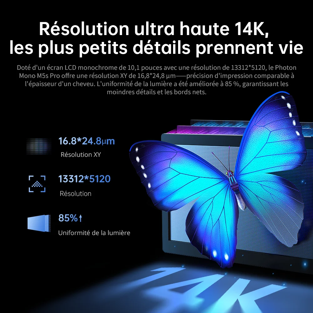 L’imprimante 3D ANYCUBIC Photon Mono M5s Pro est équipée d’un écran LCD de 10,1 pouces avec une résolution de 14K. Cette technologie permet de reproduire les moindres détails avec une grande précision.