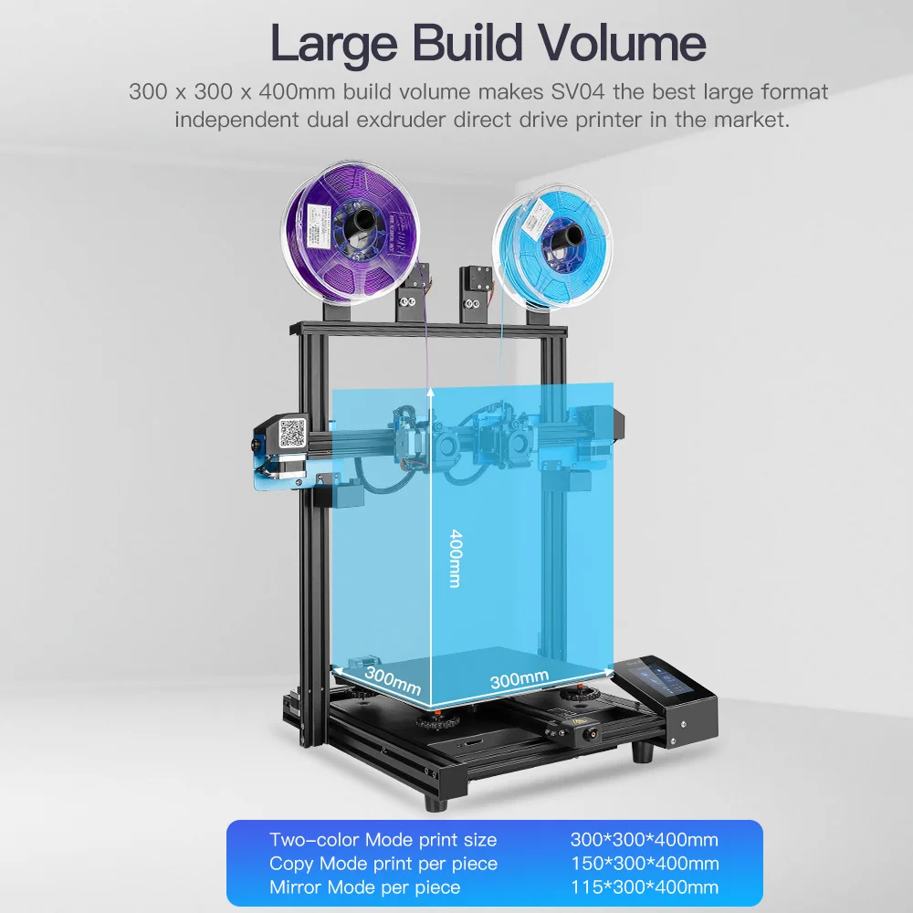 – SV04 est équipé d’extrudeuses Titan à double métal qui sont plus capables de produire des impressions de haute qualité sur une vaste gamme de matériaux, tels que le PLA, l’ABS, le PETG, le TPU, le PC, le PA, le bois, ASA et PVA. Le volume de construction de 300x300x400mm fait de SV04 la meilleure imprimante 3D indépendante grand format à double extrudeuse à entraînement direct sur le marché.