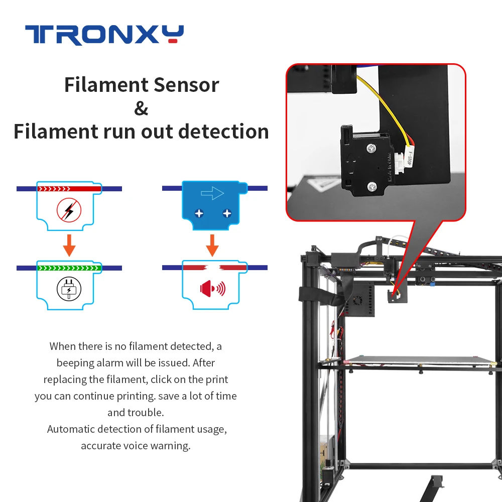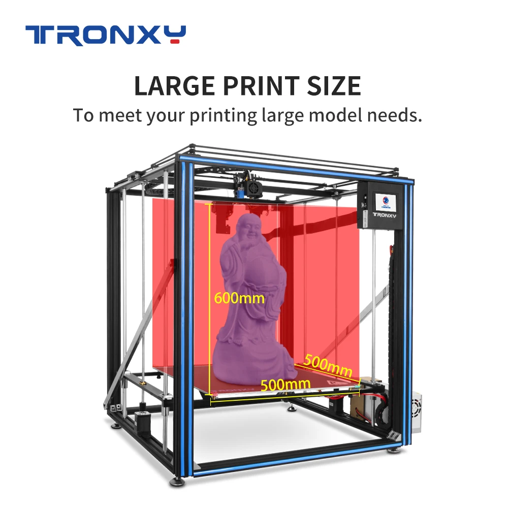Le grand volume d’impression de 500x500x600 mm vous permet de réaliser des objets de grande taille. L’écran tactile couleur de 3,5 pouces rend le contrôle de l’imprimante facile et intuitif. La fonction de reprise après une coupure de courant et le détecteur de fin de filament vous permettent de continuer l’impression sans problème.