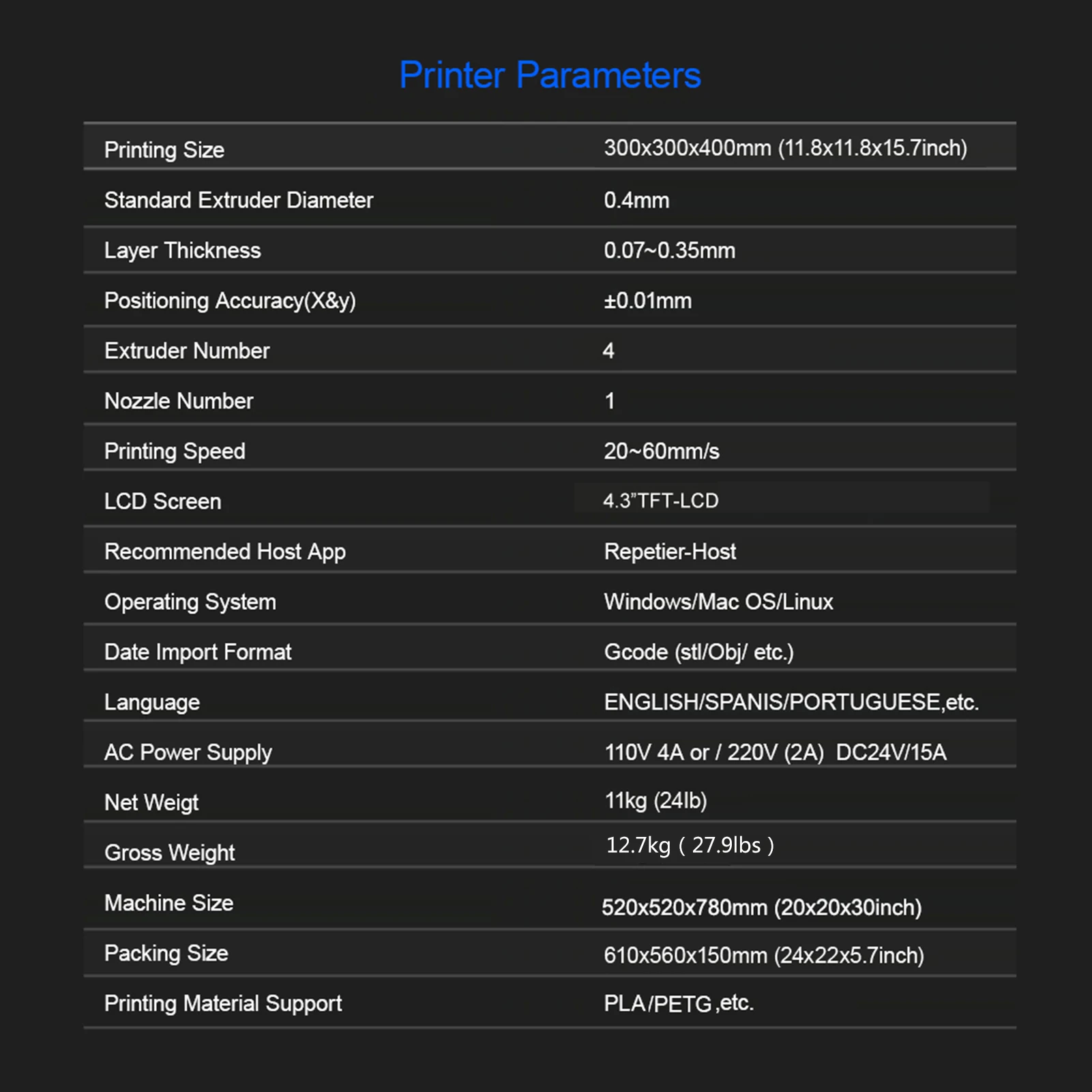 Extrudeuse 4-IN-1-OUT pour impression de plusieurs couleursÉpaisseur de la couche: 0.07 ~ 0.35mm