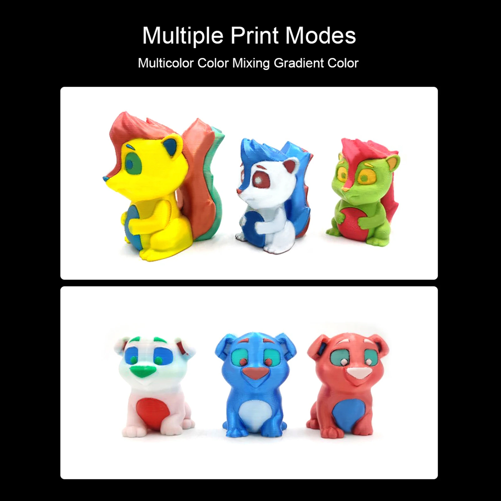 • L’extrudeuse 4-IN-1-OUT permet d’imprimer avec 4 filaments de couleur différents en même temps, grâce à son moteur de mélange de couleur automatique intégré.