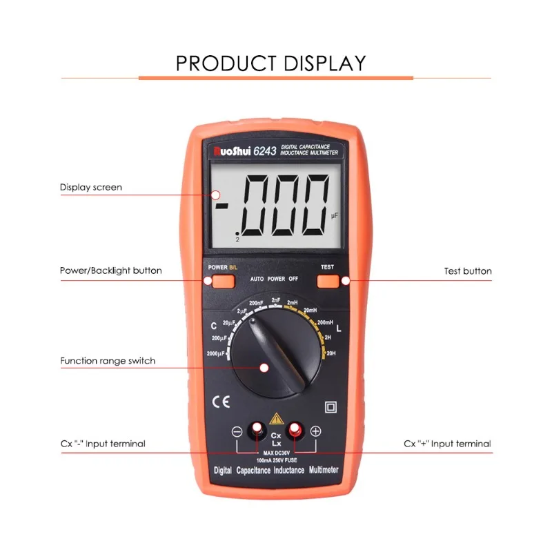 Le RuoShui VC6243 est un compteur de capacité numérique et un testeur de condensateur LCR portable. Il dispose d’un écran LCD rétro-4.2 de haute précision qui permet d’afficher les mesures de manière claire et lisible. Il fonctionne grâce à une alimentation par batterie 9V et peut mesurer l’inductance, la résistance, la capacité, la diode, le repos du transistor et le buzzer de continuité. Que ce soit pour une utilisation en laboratoire, en usine ou à la maison, cet outil est idéal pour les amateurs d’électronique.