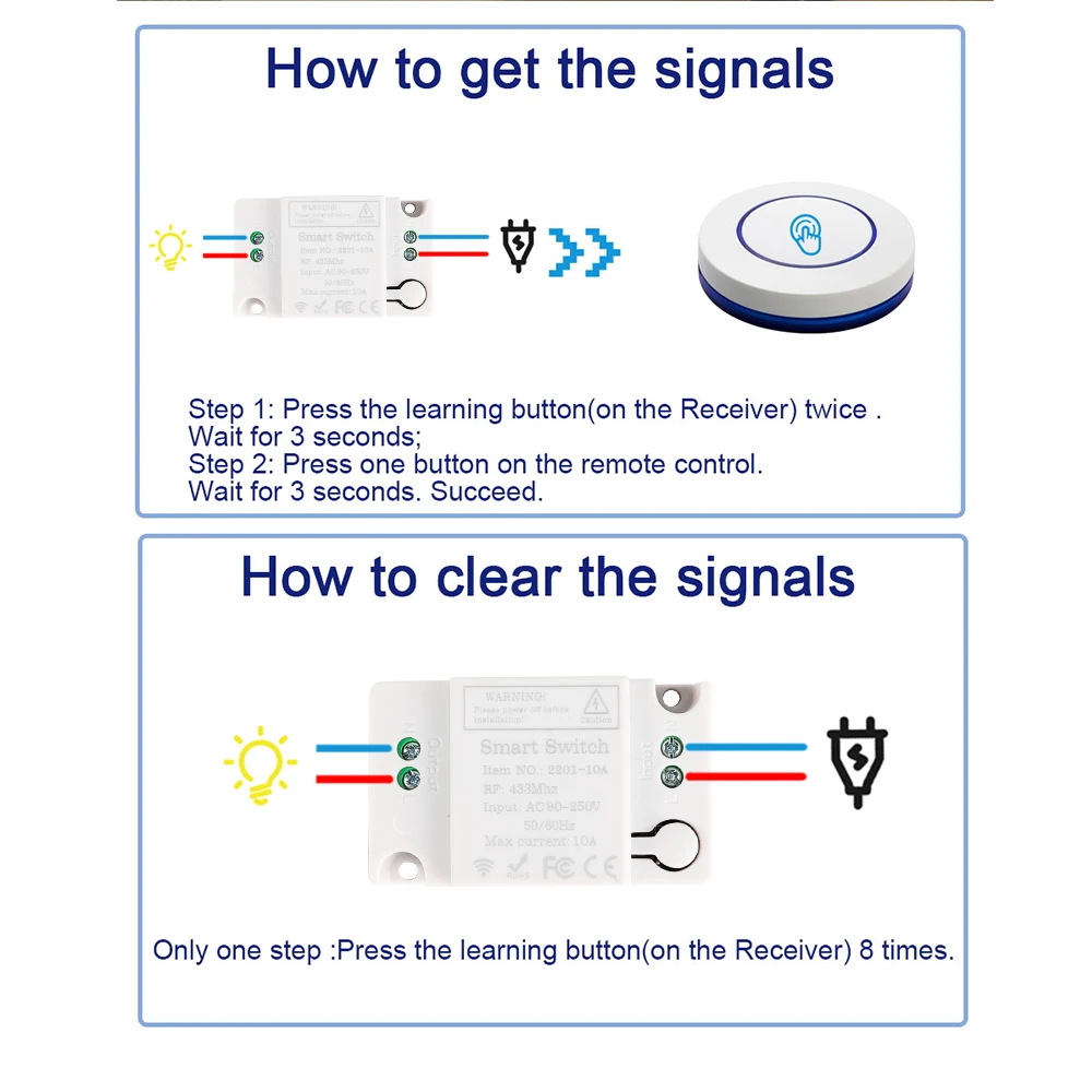SpécificationSignaux de commutateur sans fil 433MHZFacile à connecter et multi-contrôleSignal fort et contrôle longue distanceLarge gamme d’applicationsComment obtenir le signal