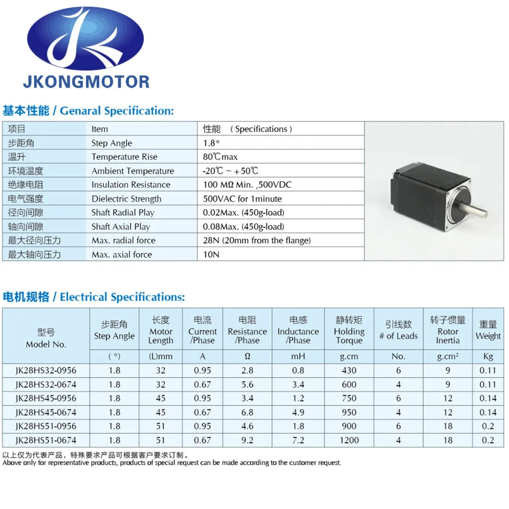 | JK28HS45-0674 | 0.95kg.cm | 0.67A | 4.56V | 6.8Ω | 4.9mH | 5mm | 4-leads | 0.14kg |