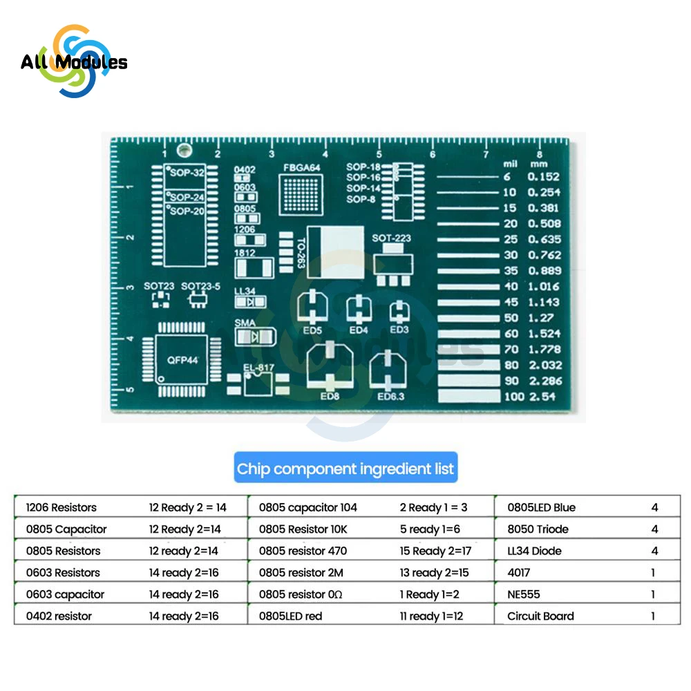 • Caractéristiques fonctionnelles: circuit lumineux à flux moyen, trois colonnes de pratique de soudage sur les côtés gauche et droit, règle arrière mm/in règle pour une mesure pratique de l’emballage des composants, compréhension du nom de l’emballage, zone d’étiquette de taille d’emballage, nom inscriptible, colonne réelle de fil de carte PCB, conception et utilisation commodes de carte PCB