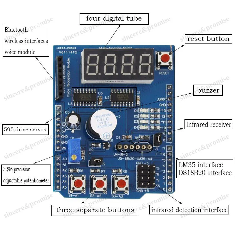 L’Ardu37UNO R3 Leonardo Mega2560 Servo Bluetooth Shield est un kit d’apprentissage multifonctionnel conçu pour les amateurs d’électronique. Il s’agit d’une base de code open-source et d’une plate-forme d’e/s simple, utilisant un langage de programmation similaire à Java et C. Ce kit permet de développer des composants électroniques tels que des commutateurs, des capteurs, des LED, des moteurs pas à pas, etc. Il peut également fonctionner comme une plate-forme logicielle indépendante qui peut communiquer avec d’autres logiciels interactifs. Ce kit offre de nombreuses fonctionnalités telles que des indicateurs LED, des interfaces de capteurs de température, des boutons, un buzzer, des interfaces sans fil, etc. Il est idéal pour réaliser des expériences interactives et créatives. Le kit comprend également un module Bluetooth et un module de reconnaissance vocale pour la communication sans fil.