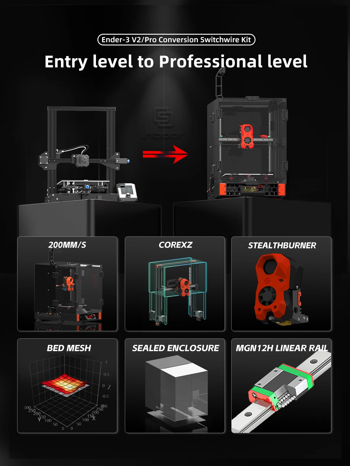 Le kit de conversion Voron E3-Switchwire est un package de mise à niveau conçu spécifiquement pour les imprimantes 3D Ender3 V2 et Ender3 Pro. Il permet d’améliorer les performances de ces machines en augmentant leur vitesse d’impression jusqu’à 200 mm/s.