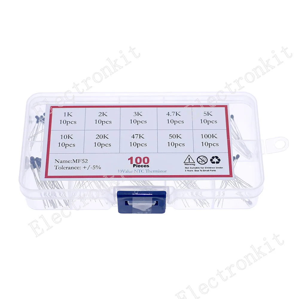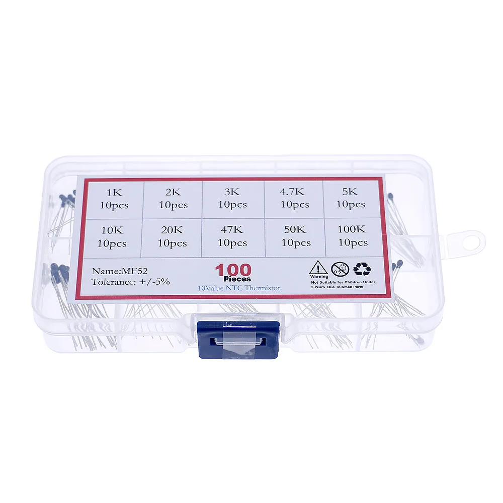 L’ensemble de résistances NTC-MF52AT est composé de 10 valeurs différentes de résistances thermiques à thermistance NTC. Les valeurs incluent 1K, 2K, 3K, 100K, 5K, 10K, 20K, 47K, 50K et 4.7K. Chaque valeur est représentée par 10 pièces, pour un total de 100 pièces dans le kit.
