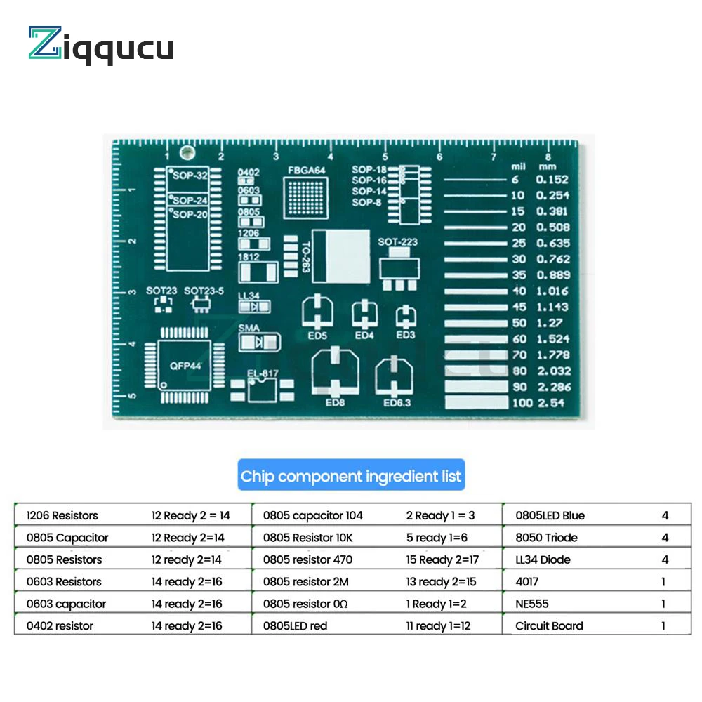 - Caractéristiques fonctionnelles: circuit lumineux à flux moyen, trois colonnes de pratique de soudage sur les côtés gauche et droit, règle arrière mm/in règle pour une mesure pratique de l’emballage des composants, compréhension du nom de l’emballage, zone d’étiquette de taille d’emballage, nom inscriptible, colonne réelle de fil de carte PCB, conception et utilisation commodes de carte PCB