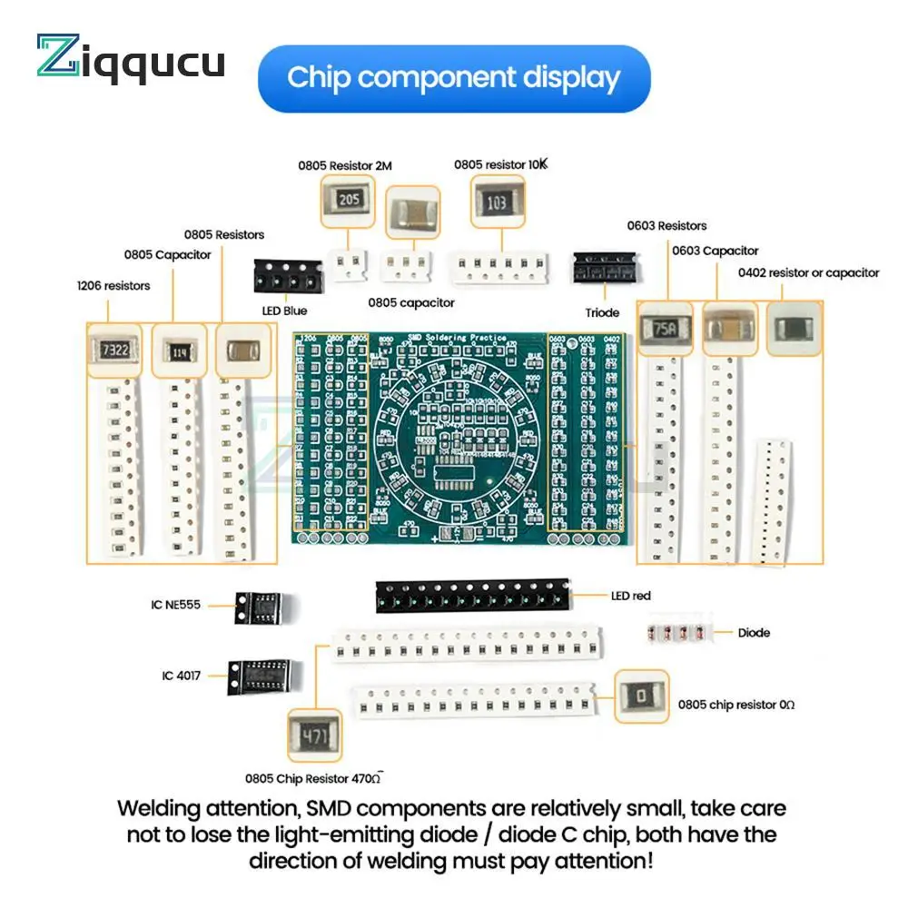 - Caractéristiques fonctionnelles: circuit d’éclairage à flux moyen, trois colonnes pour la pratique du soudage sur les côtés gauche et droit, mesure pratique des composants avec une échelle arrière, emballage à composants multiples, compréhension des noms et des tailles des emballages, liste réelle des fils PCB, conception et utilisation de PCB pratiques