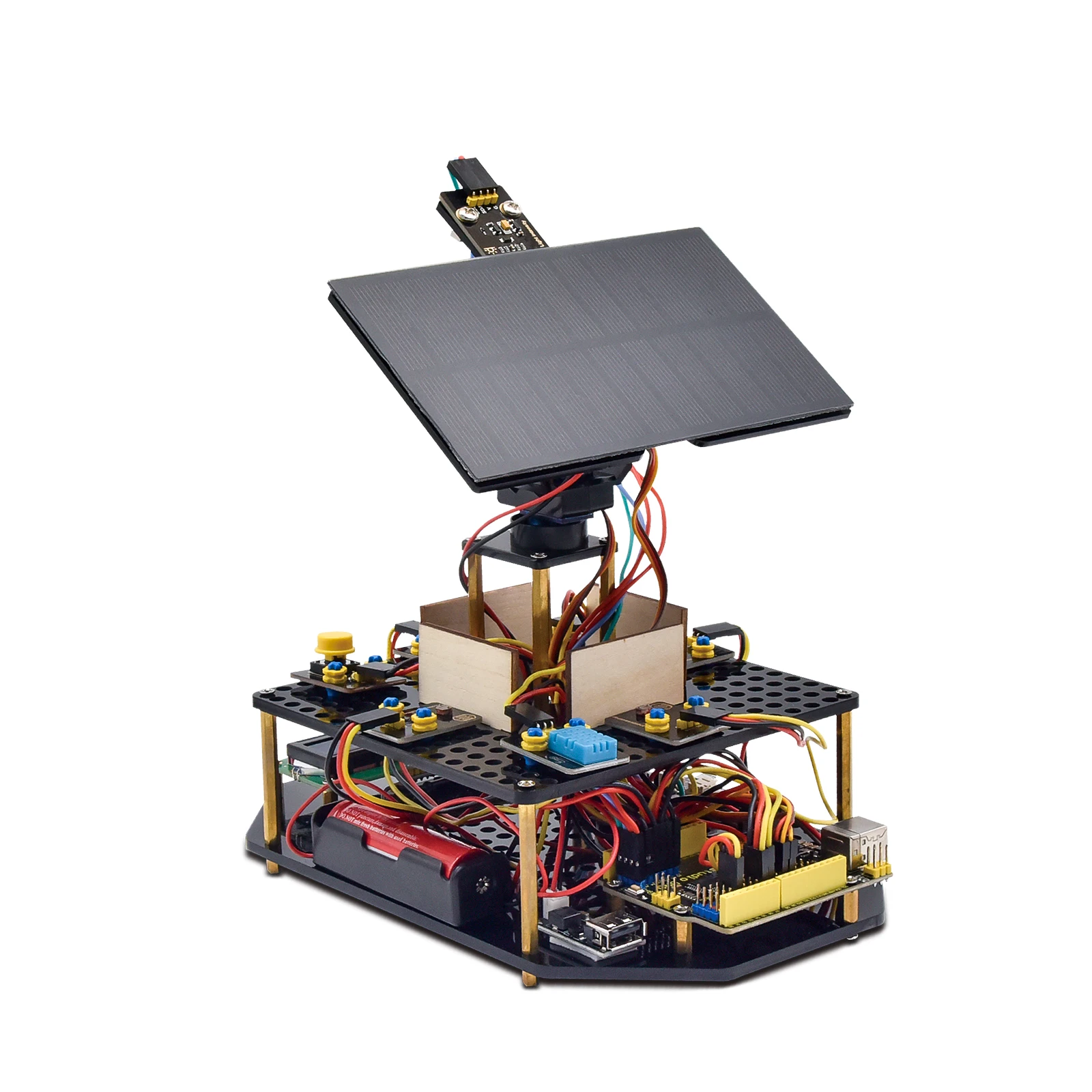 Le kit de suivi solaire lancé par KEYES est basé sur Arduino. Il se compose de 4 capteurs de lumière ambiante, de 2 servos DOF, d’un panneau solaire, etc., visant à convertir l’énergie lumineuse en énergie électronique et à charger des dispositifs d’alimentation. Il dispose d’un module de charge de téléphone intelligent, d’un capteur de température et d’humidité, d’un capteur de lumière BH1750, d’un buzzer, d’un écran LCD1602, Un module de bouton poussoir, un module de LED et d’autres, enrichissant le tutoriel et rendant les projets plus intéressants. Ce kit peut non seulement aider les enfants à mieux apprendre la programmation, mais aussi acquérir des connaissances sur l’électronique, les machines, la logique de contrôle et l’informatique.