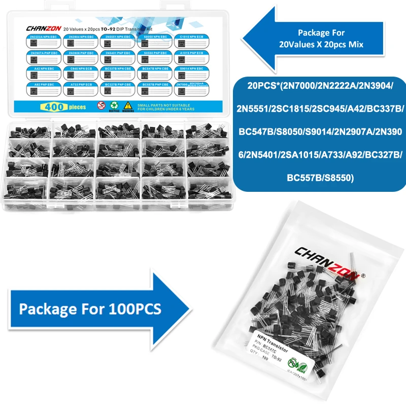 - Inclus les transistors BC547, 2N3904, 2N7000, 2N5551, 2N2222A, 2N3906, BC337B, BC557B, S8050, S8550, 2N5401, BC547B, et 2N4401