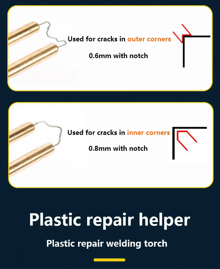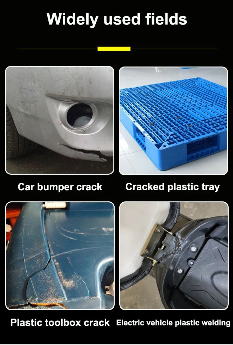 Répare au moins 98% des plastiques du marché. Parfait pour la réparation: pare-chocs, tableau de bord, support de lampe, anneau en plastique, radiateur, becquet, poignées, phares, ailes en plastique, dispositif en plastique pour voiture et moto, etc.