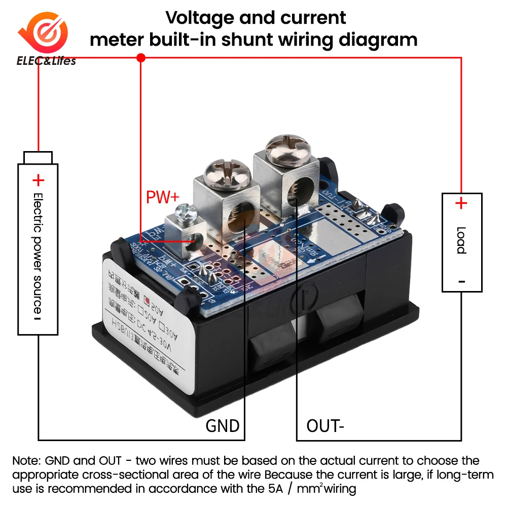 - Connectez le fil de la borne GND au pôle négatif de l’alimentation électrique en fonction de la direction du courant et connectez le fil de la borne OUT au pôle négatif de la charge, qui est connecté en série au pôle négatif du système testé;