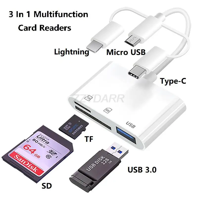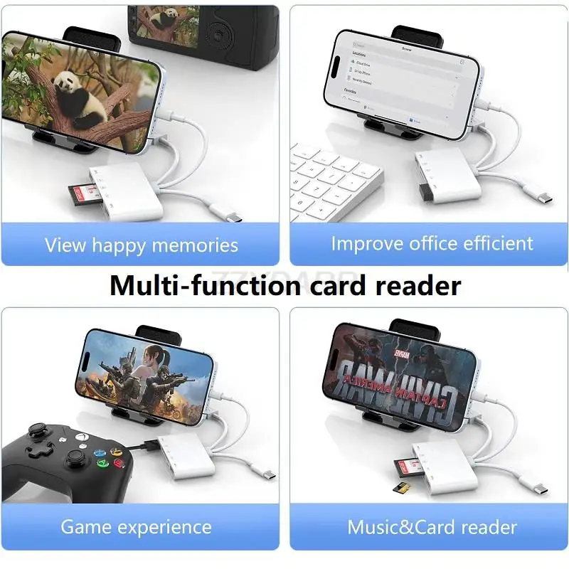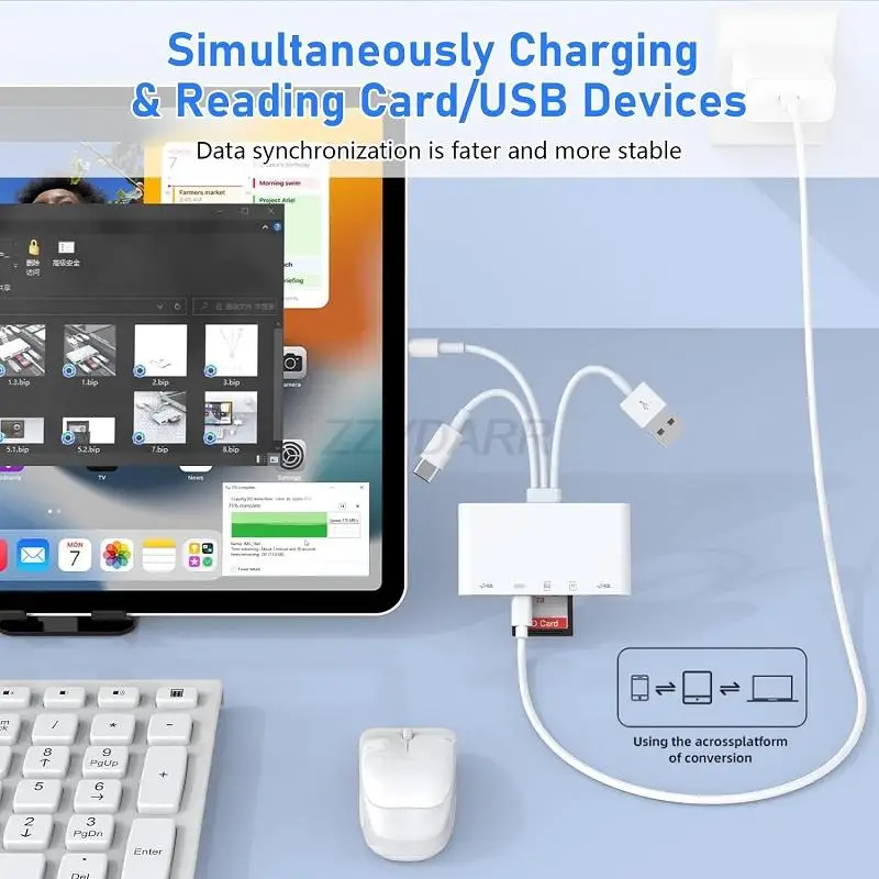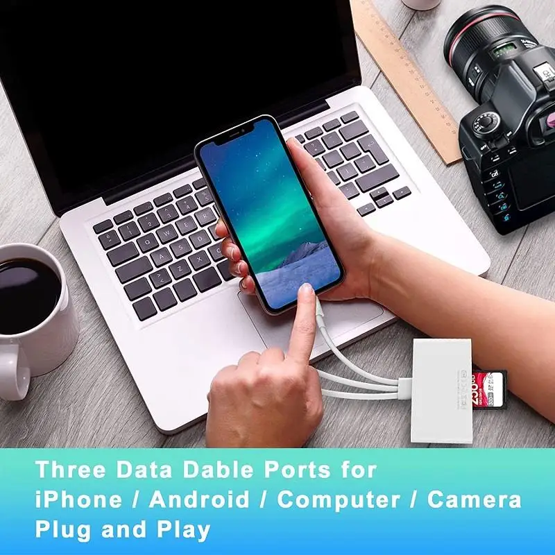 Le lecteur de carte mémoire 3 en 1 est un adaptateur d’extension compatible avec les appareils iPhone/iPad disposant d’emplacements pour cartes SD. Il peut être utilisé avec les ports USB de type C et USB A pour une connectivité facile avec différents appareils. Il prend en charge les cartes SD, les disques U, les claviers, les souris, les imprimantes, etc. Le transfert de fichiers se fait rapidement et de manière stable grâce à sa technologie 3.0. De plus, il permet de recharger l’iPhone ou l’iPad pendant le transfert de données.