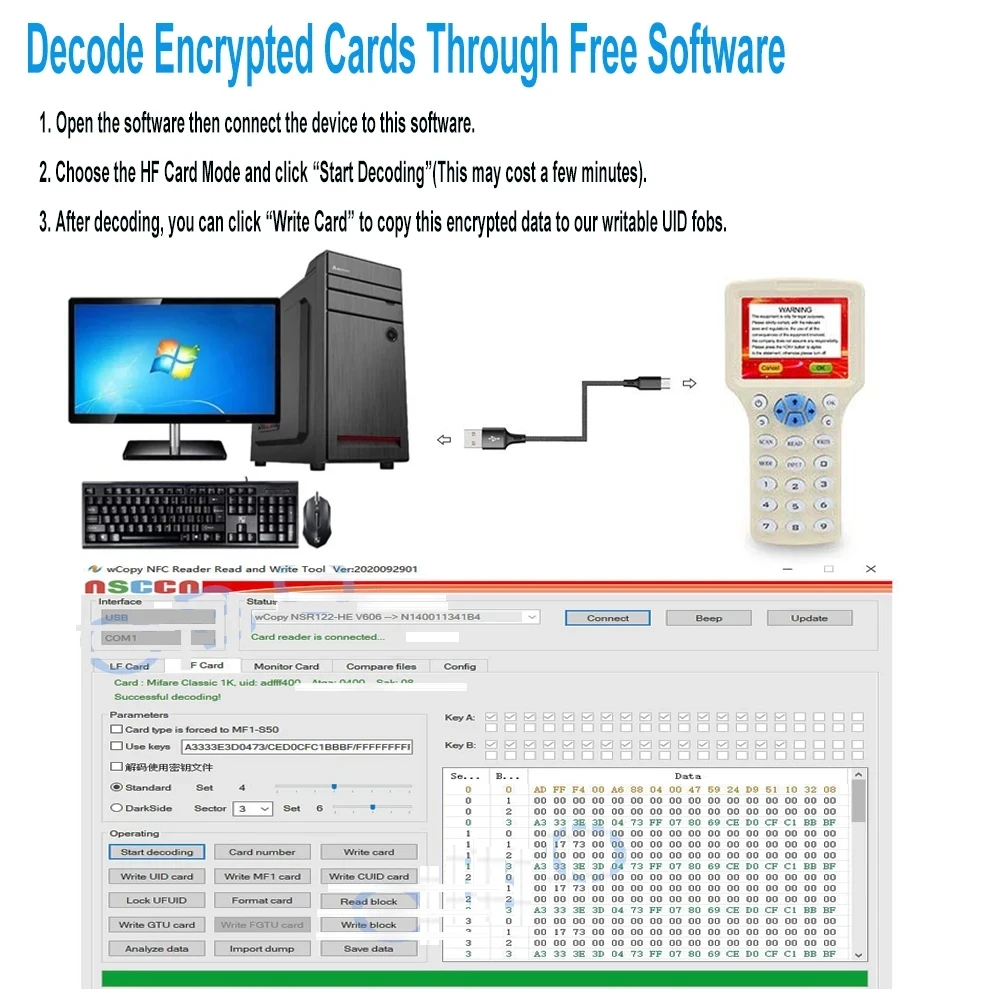 • Après le décodage, vous pouvez cliquer sur “écrire la carte” pour copier cette décoder les cartes cryptées via des données cryptées de logiciel libre à notre Fobs UID inscriptibles.