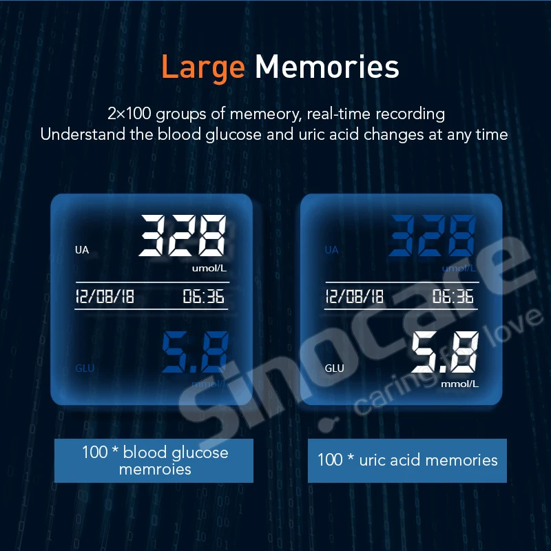 Le lecteur de glycémie a une mémoire pour stocker jusqu’à 100 résultats de test, ce qui permet aux utilisateurs de suivre facilement leurs niveaux de glycémie. Les bandelettes de test ont une date d’expiration de 2 ans pour les bandelettes de test de glycémie et de 1 an pour les bandelettes d’acide urique.