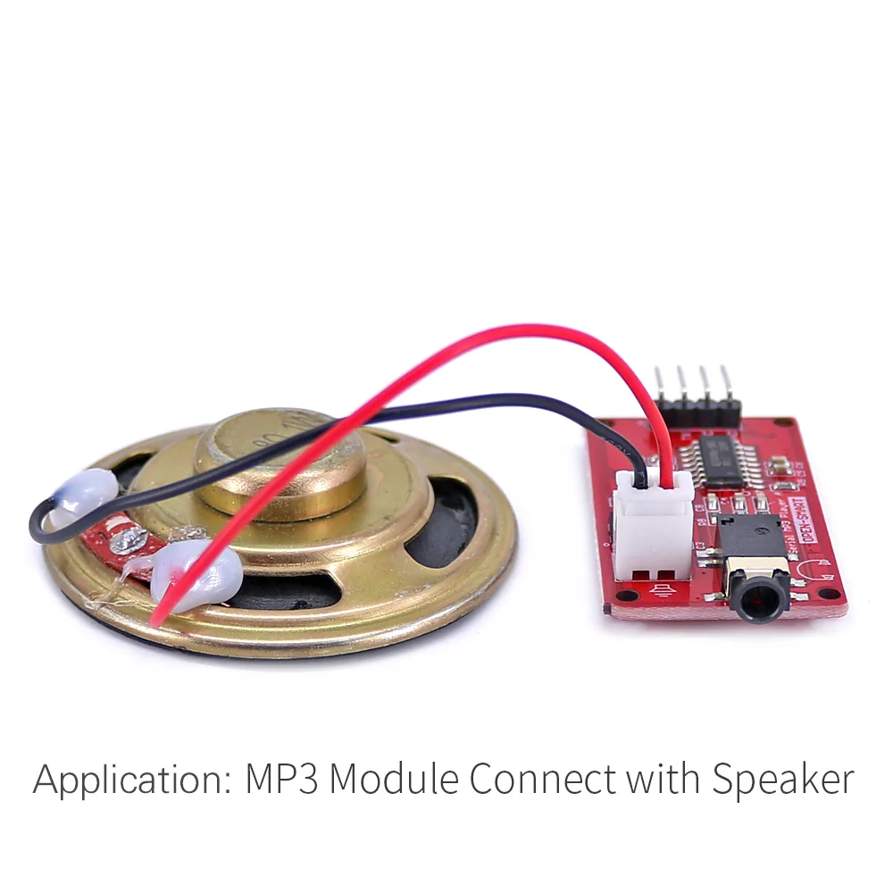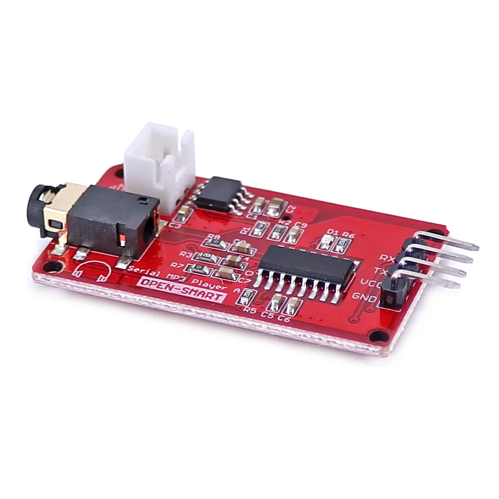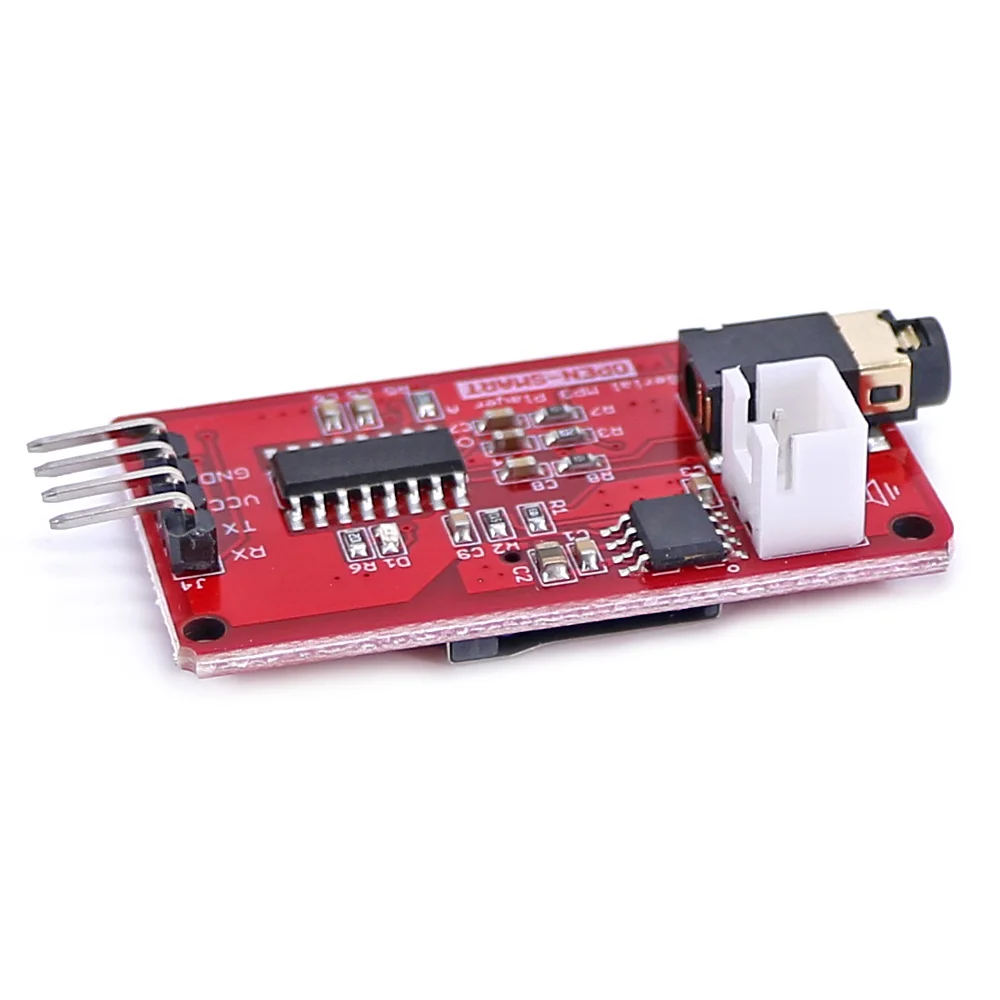 Il y a une prise de carte TF à bord, vous pouvez donc brancher la carte micro SD qui stocke les fichiers audio. MCU peut contrôler l’état de la lecture MP3 en envoyant des commandes au module via le port UART, telles que changer de chanson, changer le volume et le mode de lecture, etc.