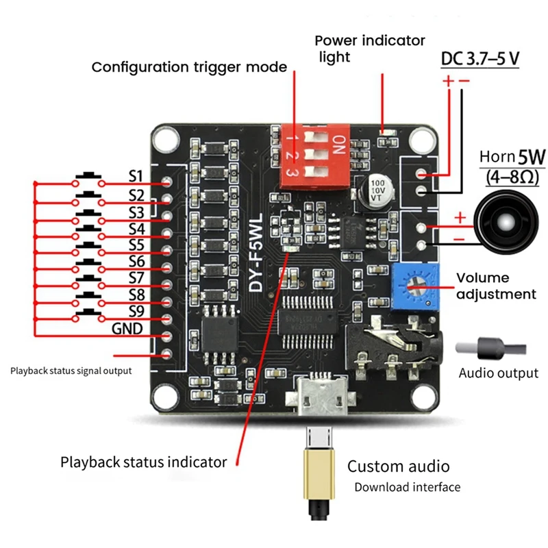 Prend en charge le format de décodage MP3, WAV; peut segmenter le déclenchement de 9 pistes; 3.7-5VDC alimentation à large tension, lecteur direct 4-8Ω haut-parleur, la puissance de sortie maximale est de 5W;