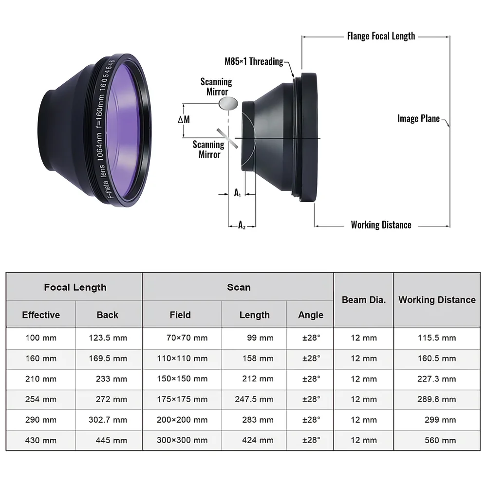 L’objectif KINDLELASER F-thêta 1064nm est équipé d’une lentille de haute qualité qui assure une transmission de la lumière efficace et minimise les pertes d’énergie. Sa longueur focale de 63-420mm permet de concentrer le faisceau laser pour des applications précises. Le champ de balayage de 50×50 à 300×300 permet de couvrir une large zone de travail, ce qui le rend idéal pour une utilisation dans les applications nécessitant un balayage laser étendu.