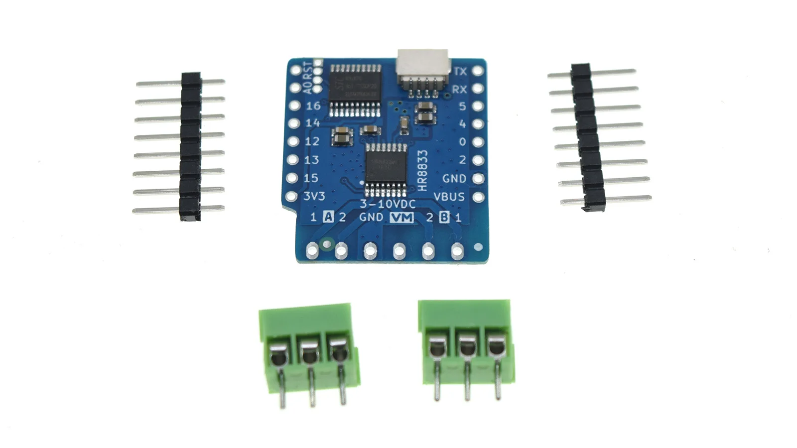 | Tension d’alimentation: VM = 3-10VDC | Plage de tension compatible avec différents types de moteurs |