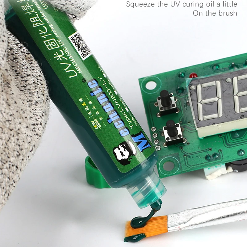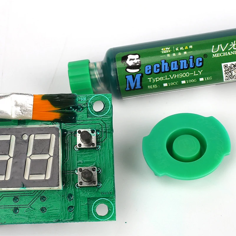L’encre de masque de soudure UV Mécanicien est utilisée pour isoler la carte de circuit imprimé contre les courts-circuits et les arcs électriques. Elle protège également les traces de PCB de la corrosion et de l’humidité. Cette encre est très utile pour réparer les PCB après soudure et reprise.