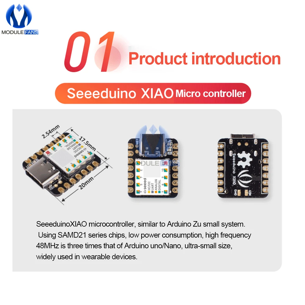 Le microcontrôleur Seeeduino XIAO SAMD21 Cortex M0 + est le plus petit membre de la série Seeeduino. Il s’agit d’un microcontrôleur Arduino intégré à la puce SAMD21. Malgré sa petite taille, cette carte offre de bonnes performances et une consommation d’énergie réduite, ce qui en fait un choix idéal pour les appareils portables et les petits projets.