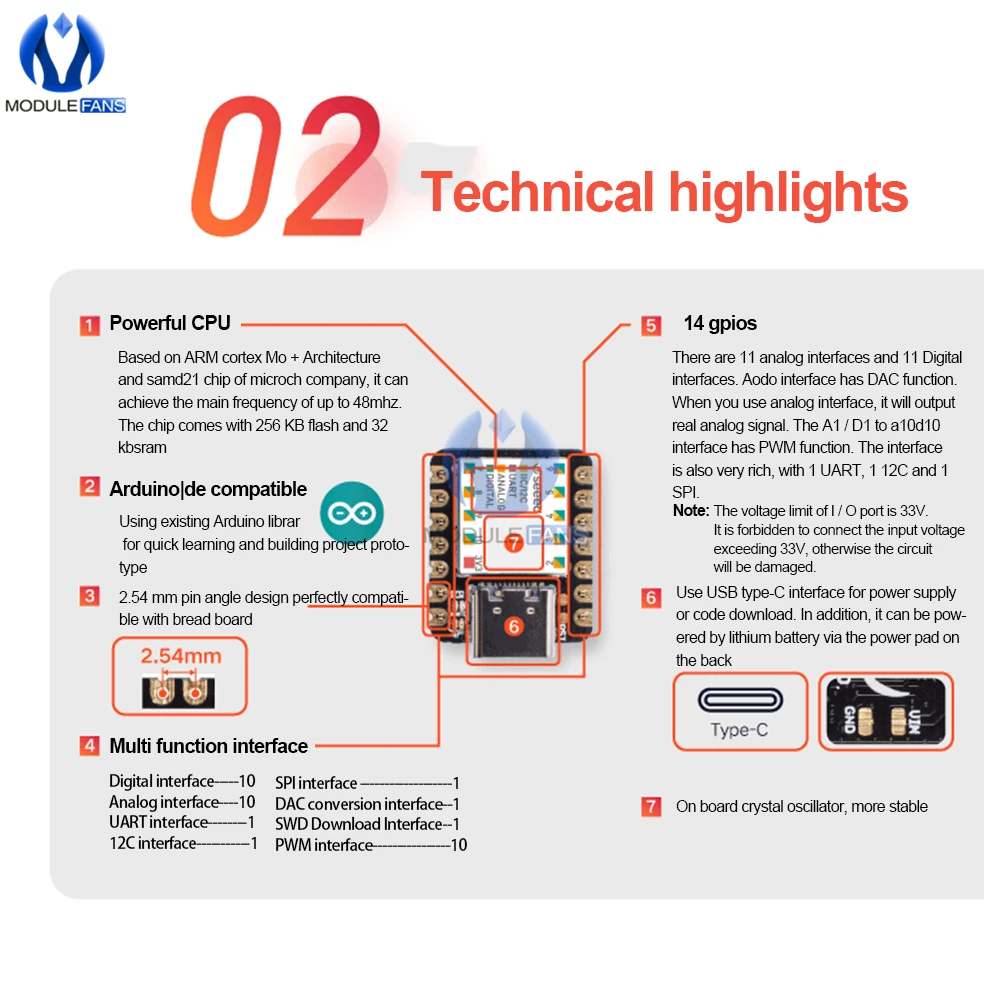 - Interfaces de développement multiples: 11 broches numériques/analogiques, 10 broches PWM, 1 DAC Sortie, 1 interface SWD Bonding pad, 1 interface I2C, 1 interface UART, 1 Interface SPI