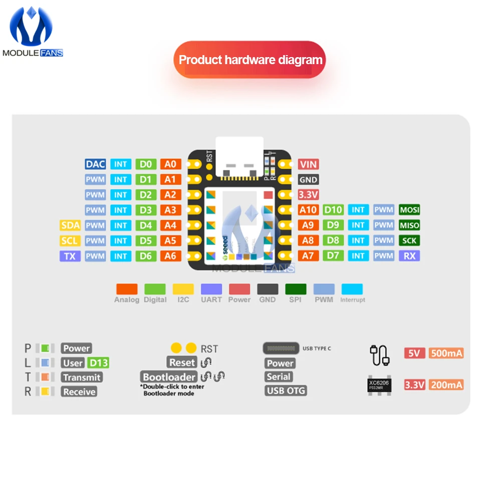 Le microcontrôleur Seeeduino XIAO SAMD21 Cortex M0 + dispose de 11 broches numériques/analogiques, 10 broches PWM, 1 DAC Sortie, 1 interface SWD Bonding pad, 1 interface I2C, 1 interface UART et 1 Interface SPI.