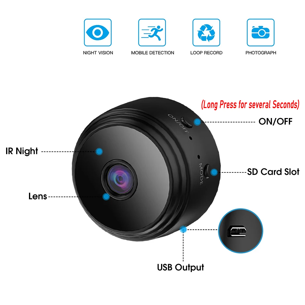 | ABS | diamètre de la caméra d’environ 4.4cm, hauteur d’environ 2.4cm, diamètre du support d’environ 3.1cm, hauteur d’environ 3.9cm | noir | 720P | avi | prend en charge la carte TF, jusqu’à 128 Go (TF non inclus) | H.264 | Android/iOS | grand angle de 150° | 30 minutes | batterie au lithium | 150mAh |