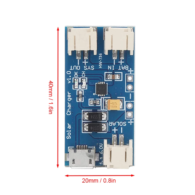 | Petite taille (2cm x 4cm) | Charge solaire limitée à une tension recommandée de 6V |