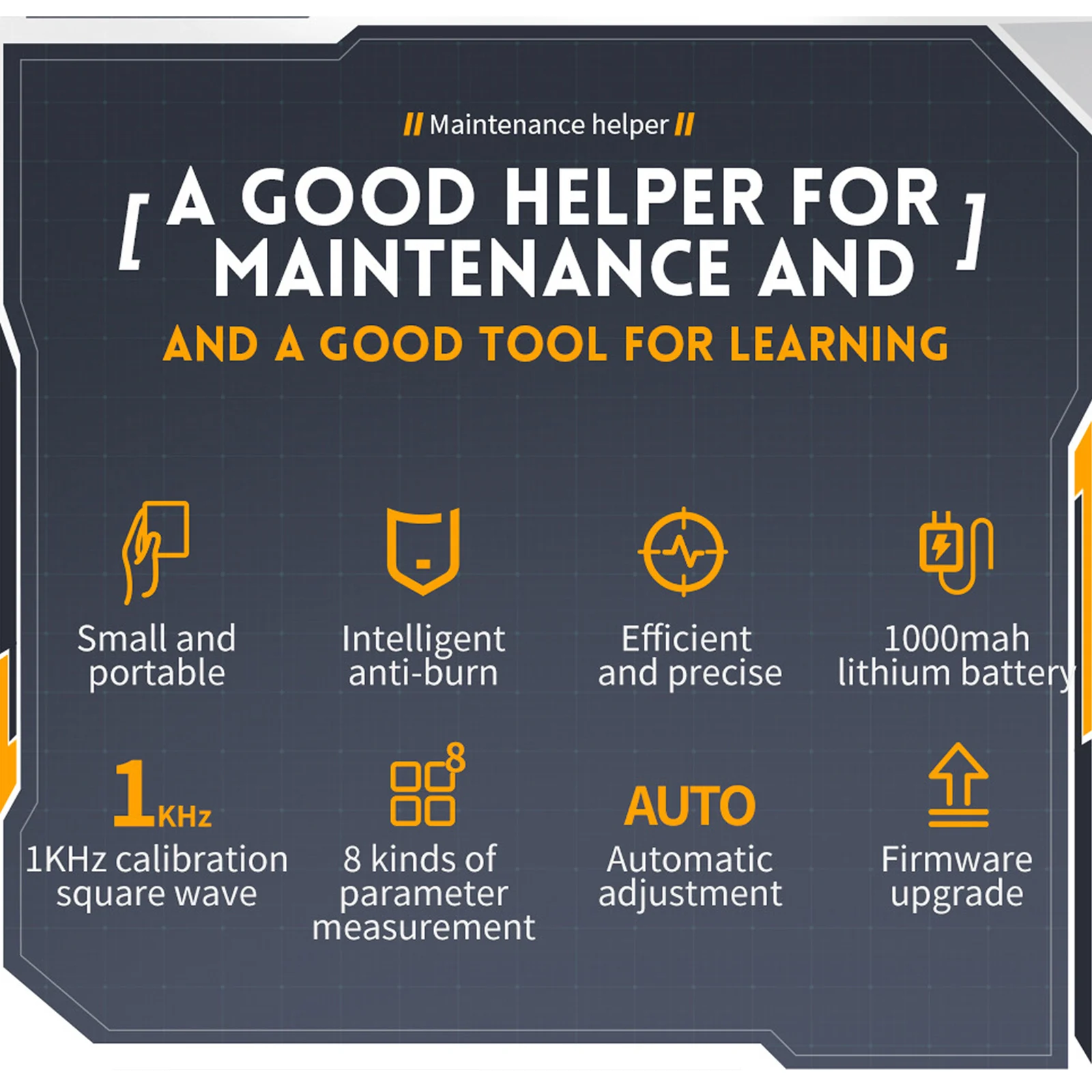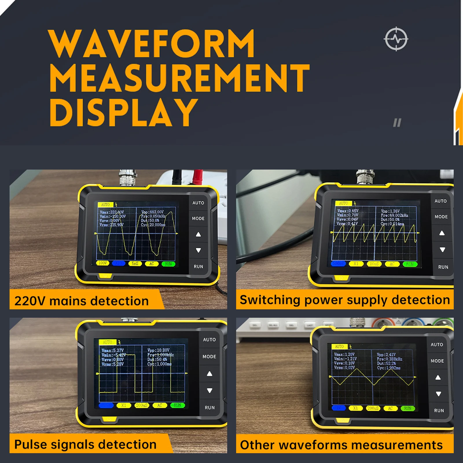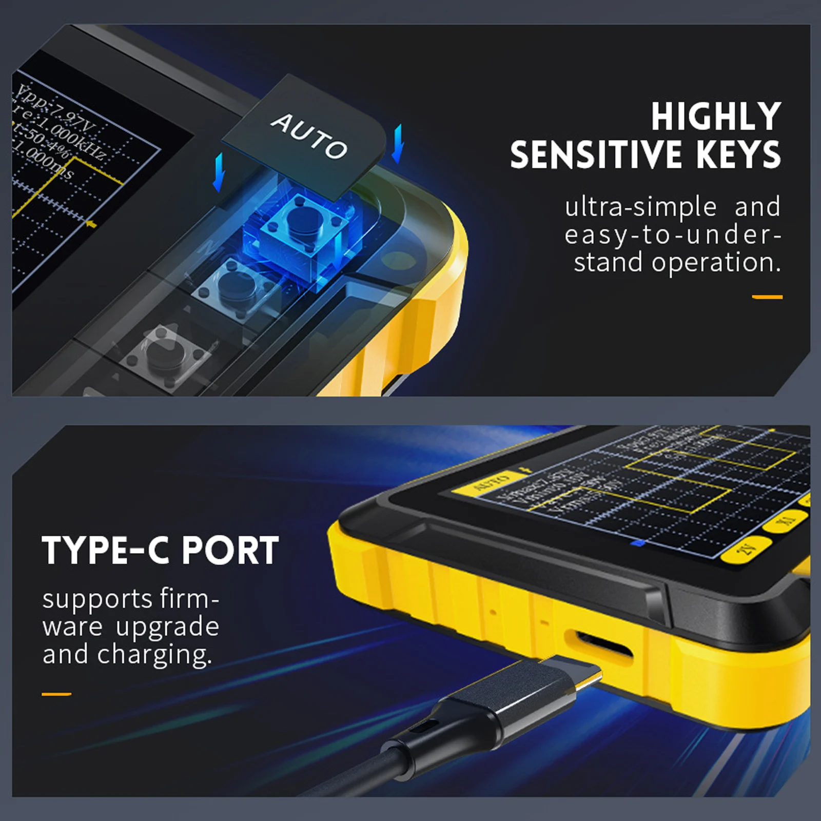 Avec une fonction de déclenchement complet automatique, normale et unique, cet oscilloscope peut être utilisé librement pour les signaux analogiques périodiques et les signaux numériques non périodiques. Avec un écran LCD HD de 2.8 pouces avec une résolution de 320 x 240, l’interface Type-C prend en charge la transmission et la charge des données.